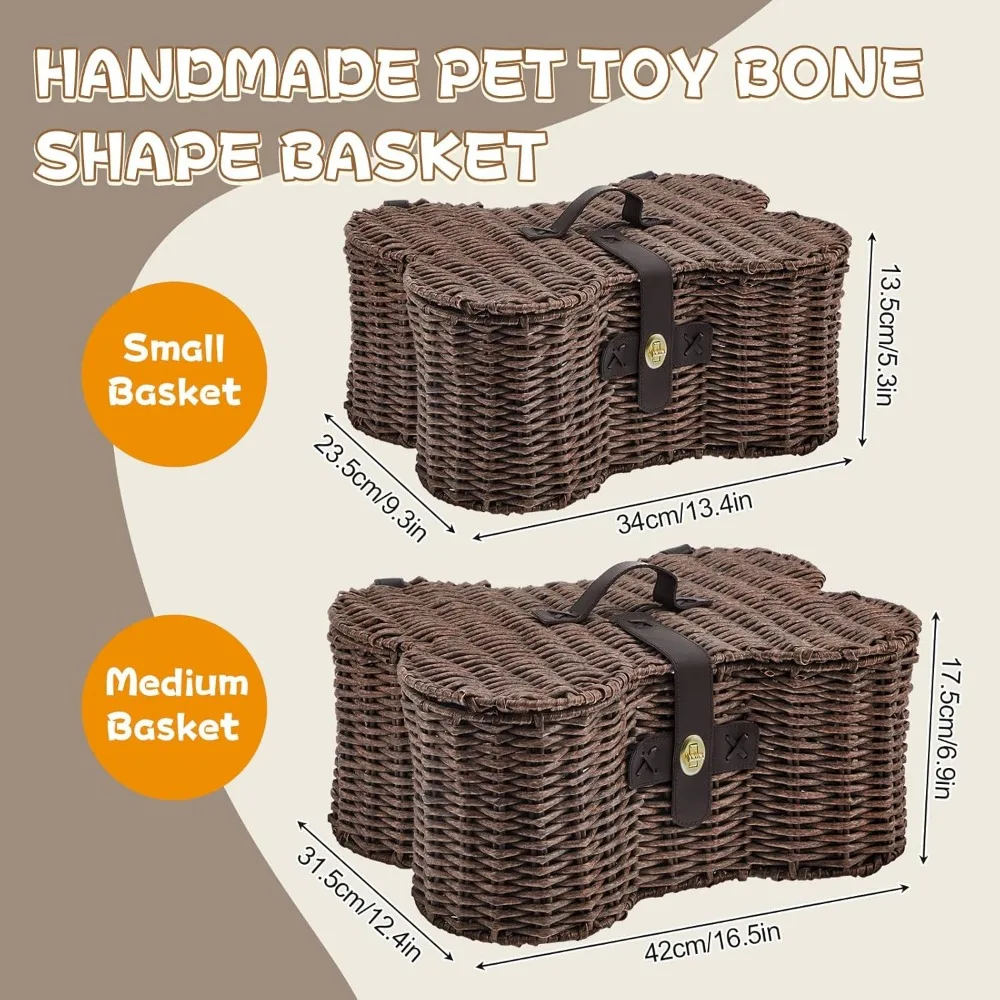 2 Set Large Small Dog Toy Basket with Lid Bone Shaped Basket for Dog Natural Wicker Woven Handmade Pet Puppy Toy Organizer and